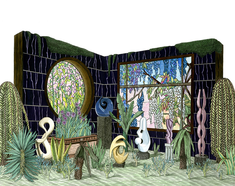 Modern Art Sculpture Garden with Tiffany Stained Glass windows